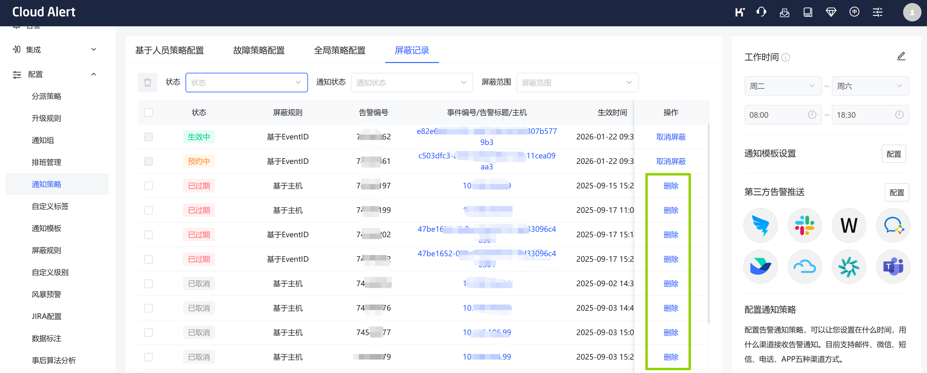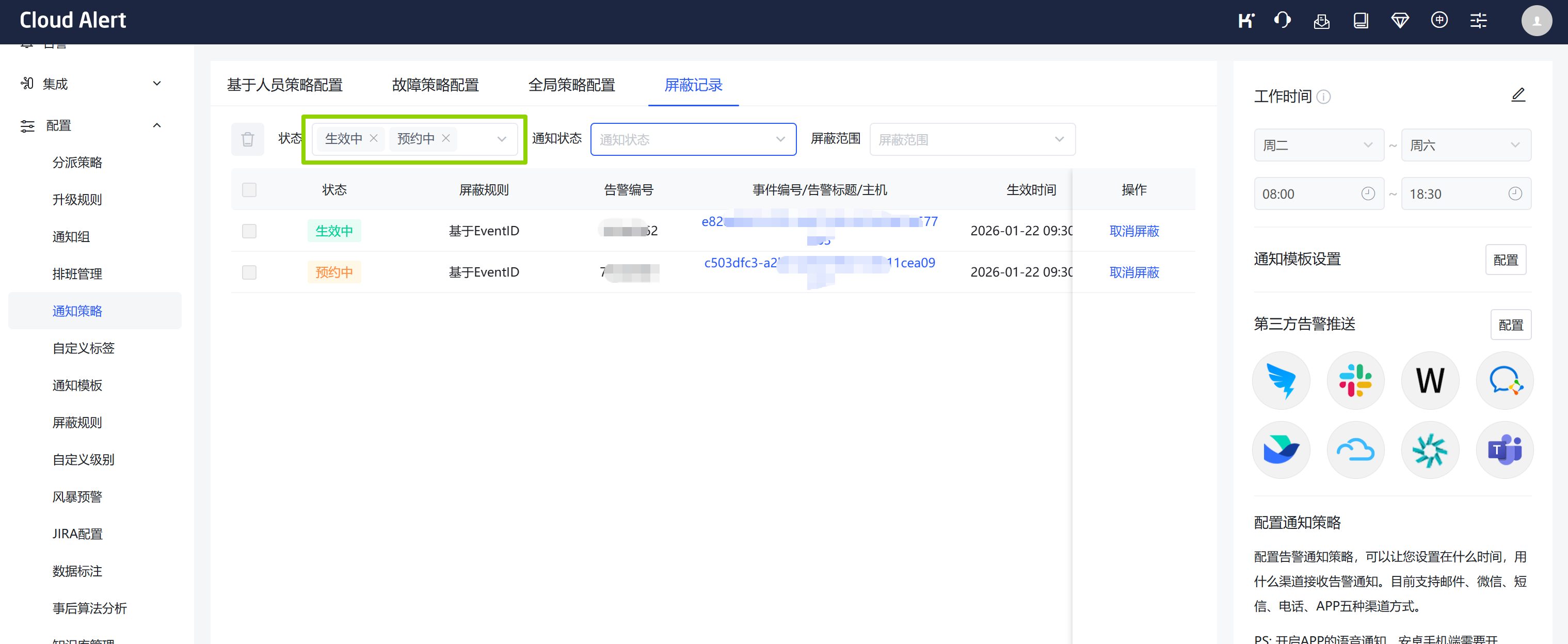 - 入口:配置-通知记录-屏蔽记录