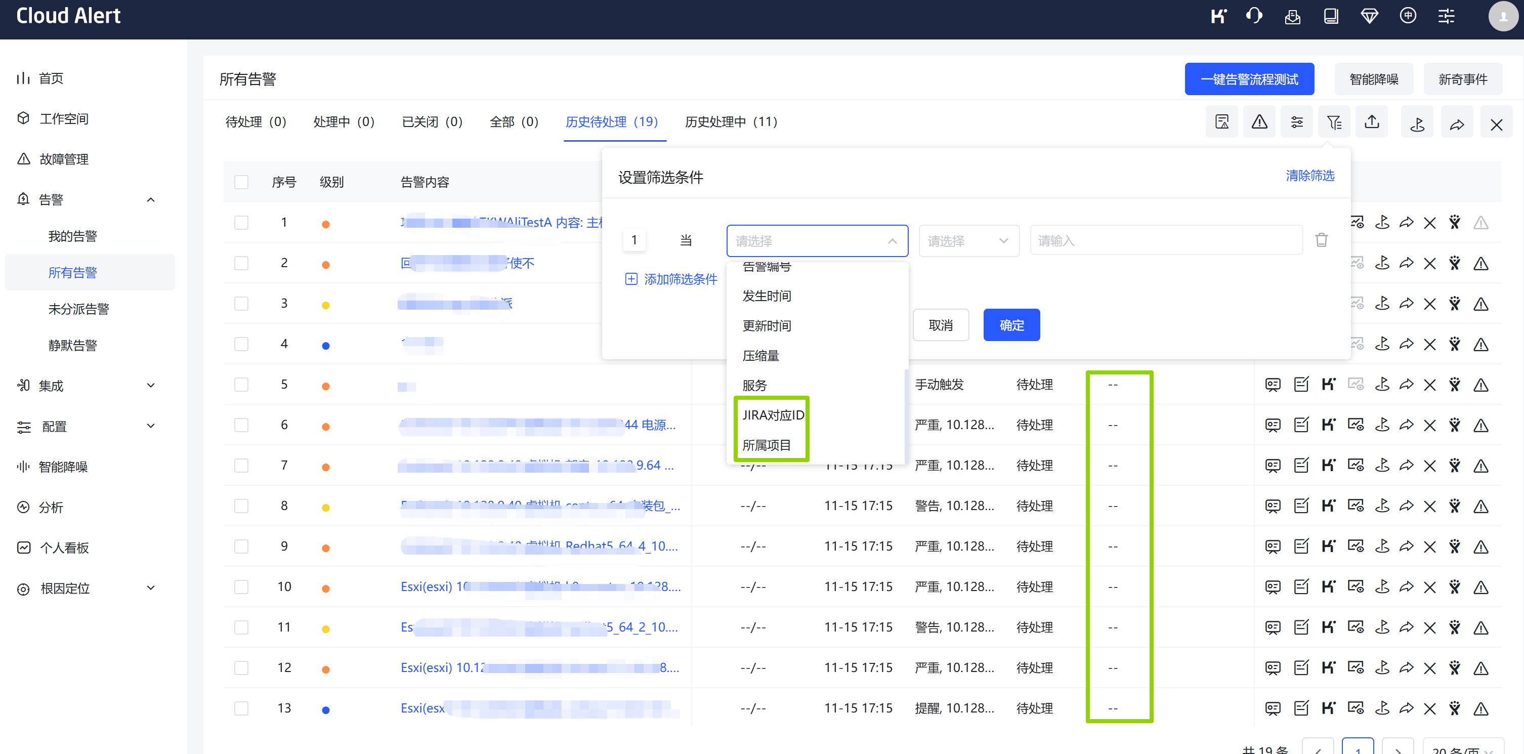- 告警-告警列表-筛选-增加[JIRA对应ID]和[所属项目]为筛选条件